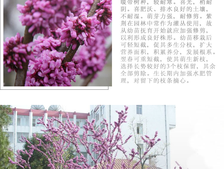 叢生紫荊先花后葉,花形如蝶,滿樹皆紅,艷麗可愛,葉片心形,多叢植于草坪邊緣和建筑物旁,園路角隅或樹林邊緣。因開花時,葉尚未發出,故宜與常綠之松柏配植為前景或植于淺色的物體前面,如白粉墻之前或巖石旁。