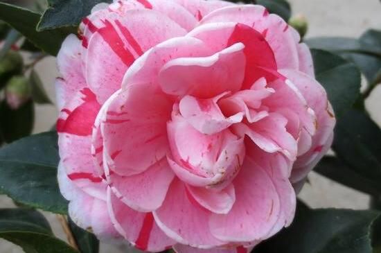 花鶴令又叫花鶴翎,是紅色系山茶的品種。花色為桃紅色,有白色斑點(diǎn),花朵飽滿,花瓣繁多且排列整齊。內(nèi)部三輪花瓣包裹著花蕊,外部花瓣自然伸展,花期在2~3月份。